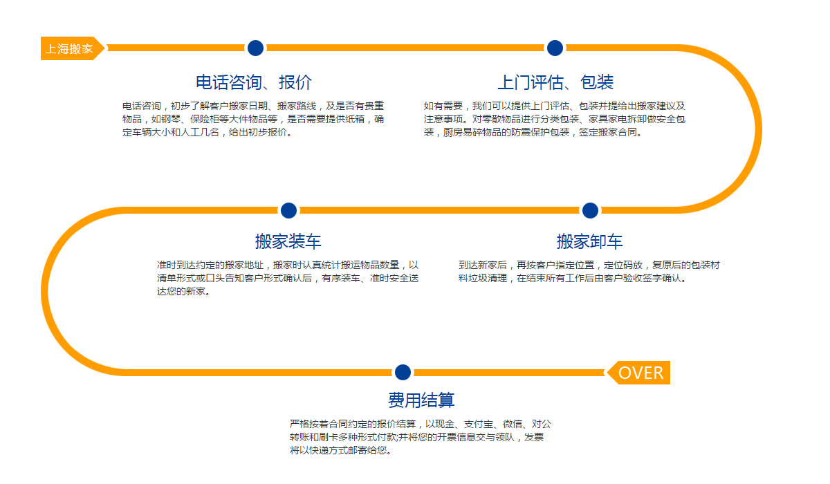 到达新家后,再按客户指定位置,定位码放,复原后的包装材料垃圾清理,在结束所有工作后由客户验收签字确认。费用结算